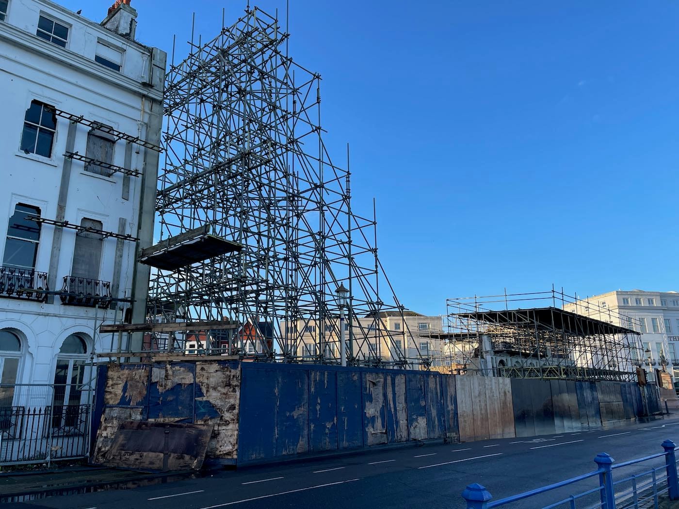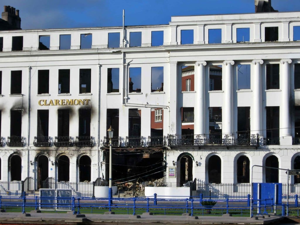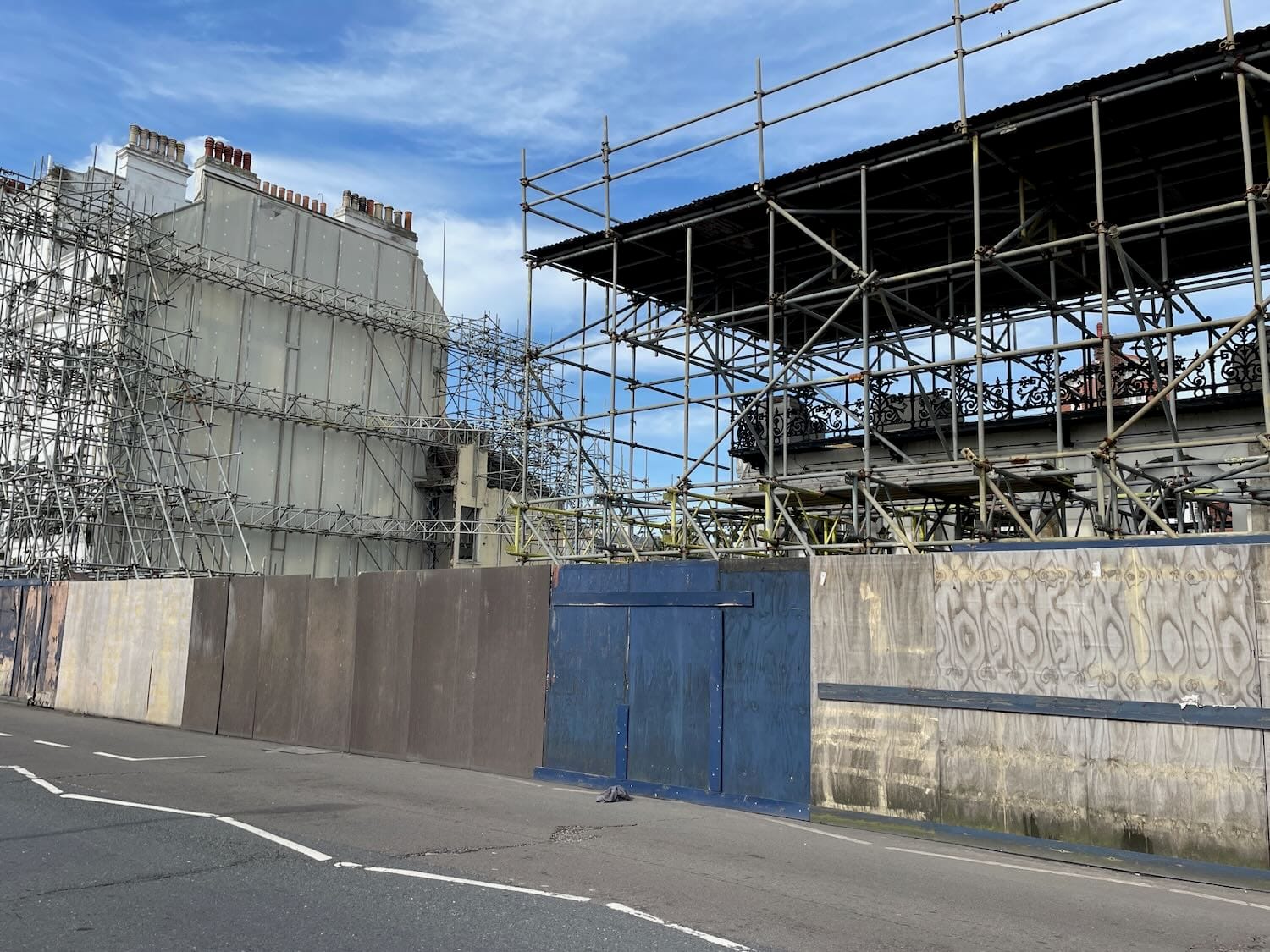 The burnt-out remains of the seafront Claremont Hotel, propped up with scaffolding, have been surrounded by hoardings which have become more dilapidated over the past two years. REBECCA MAER asked Eastbourne Borough Council and the developer what was being done to improve its appearance.