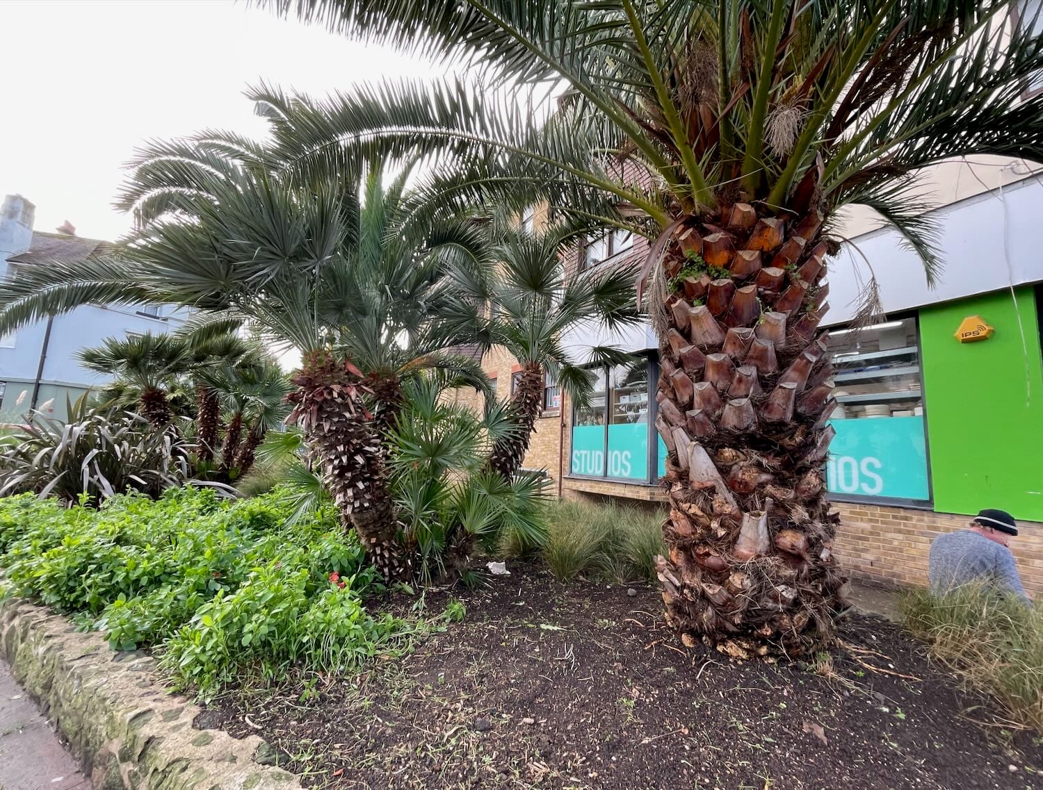 Somebody once planted it with graceful palm trees and colourful blooms, the whole bordered by an attractive low wall.