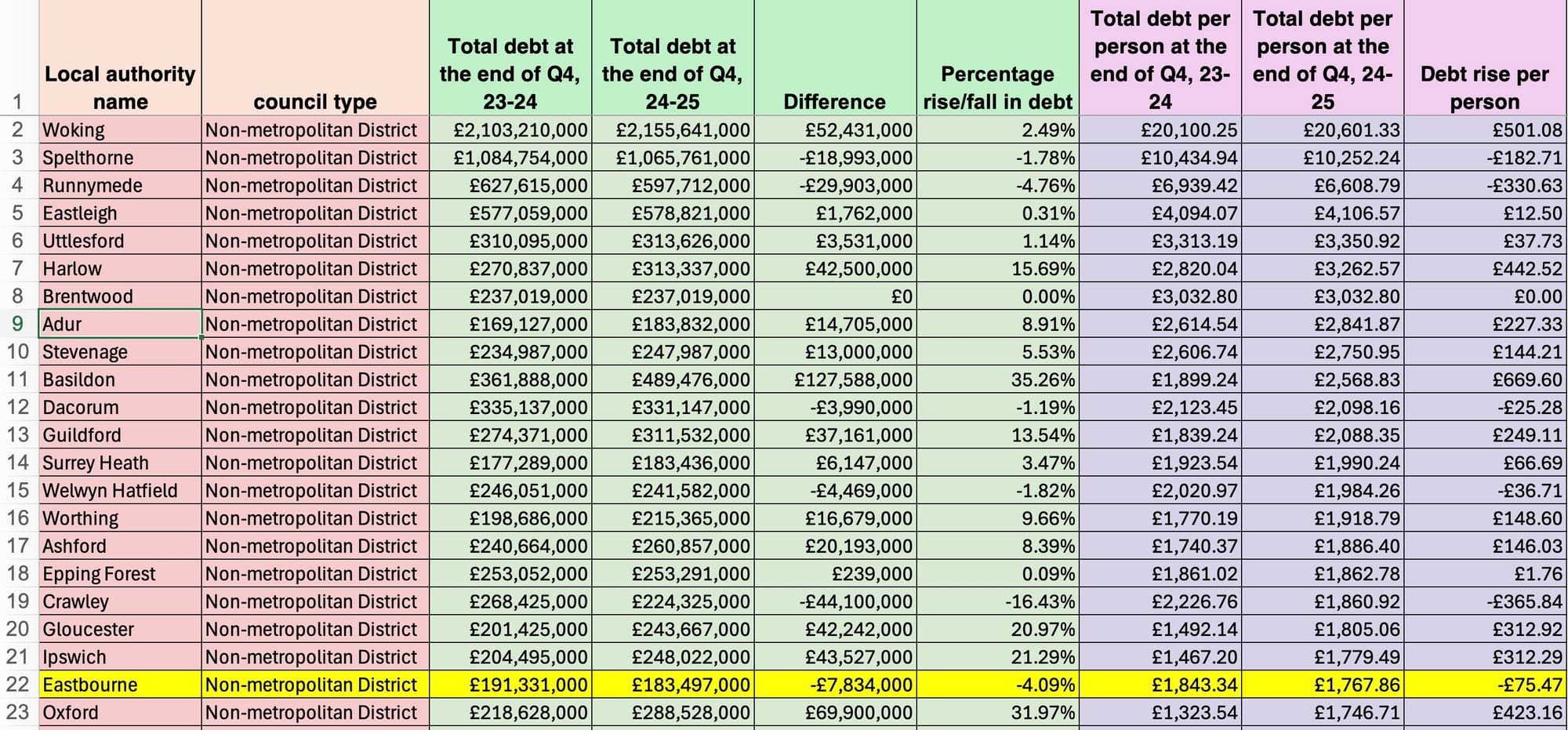 Eastbourne is in the top 20% of non-metropolitan district total debt levels across England measured by debt per person: in position 21 out of 164 similar councils compared with position 16 the previous year.