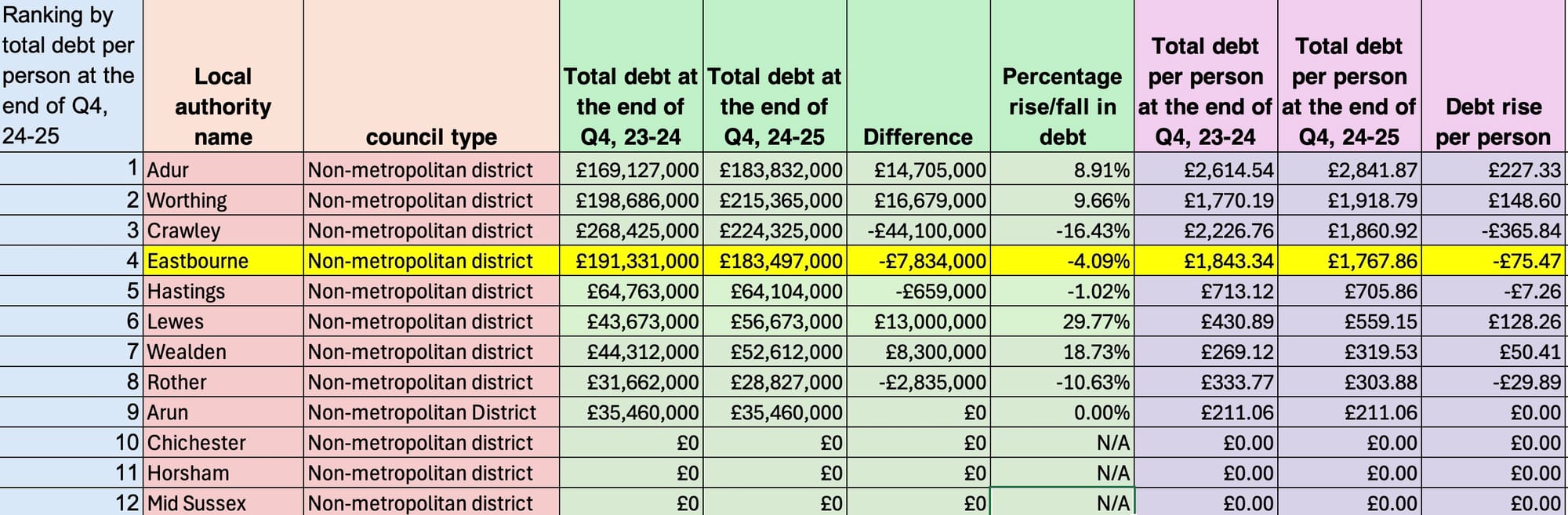 Three other Sussex districts have higher debts per resident: Adur, Worthing and Crawley.