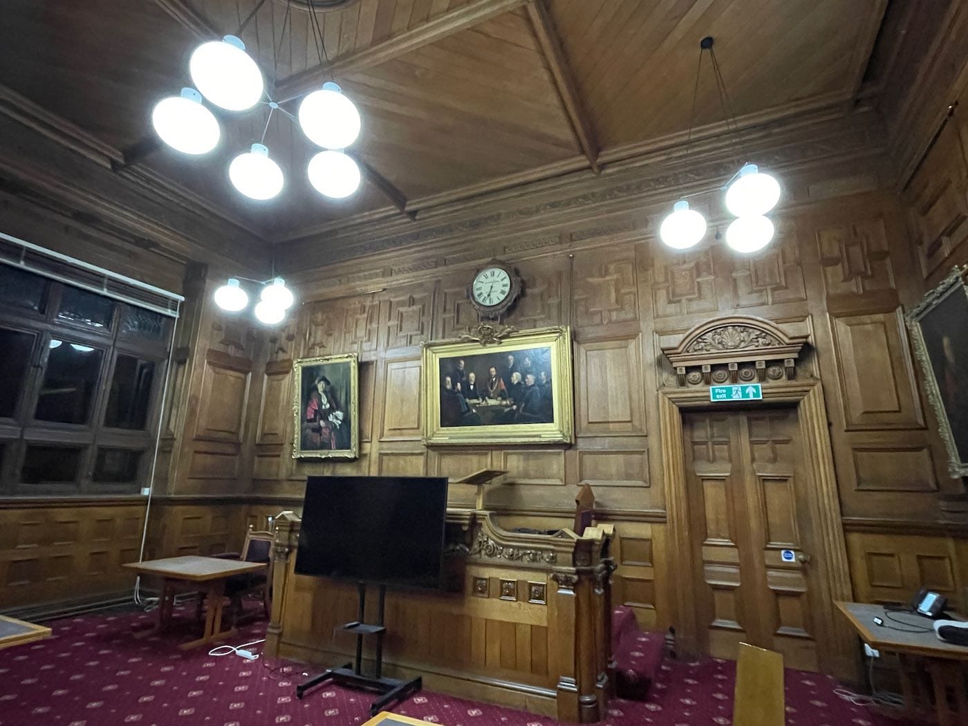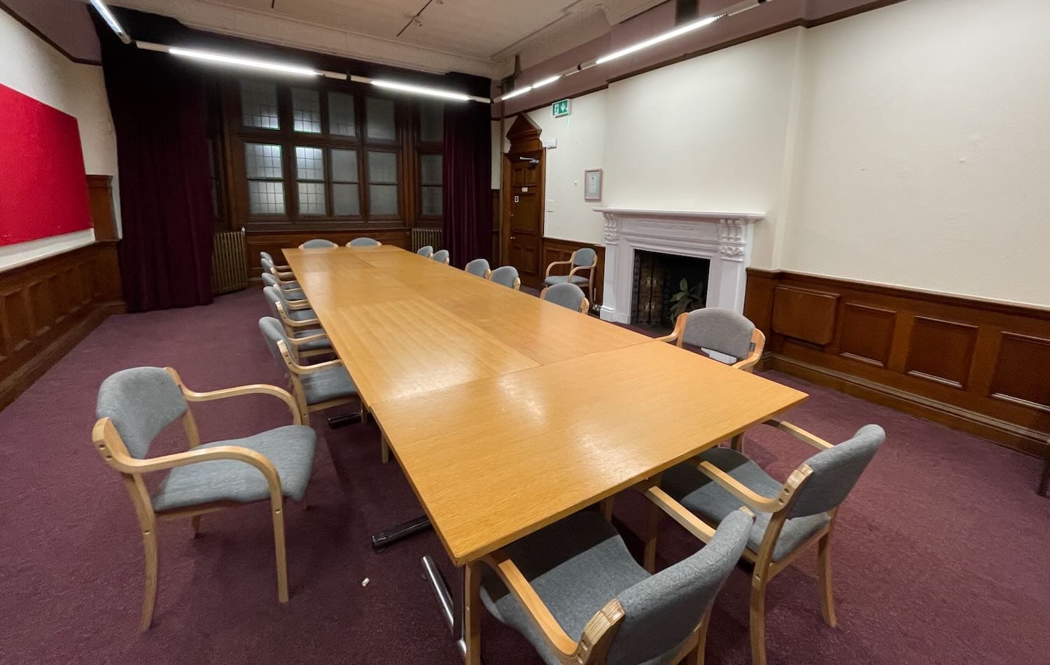 Among the rooms for hire is the atmospheric wood-panelled chamber on the first floor with a high ceiling and ornately-carved raised area.