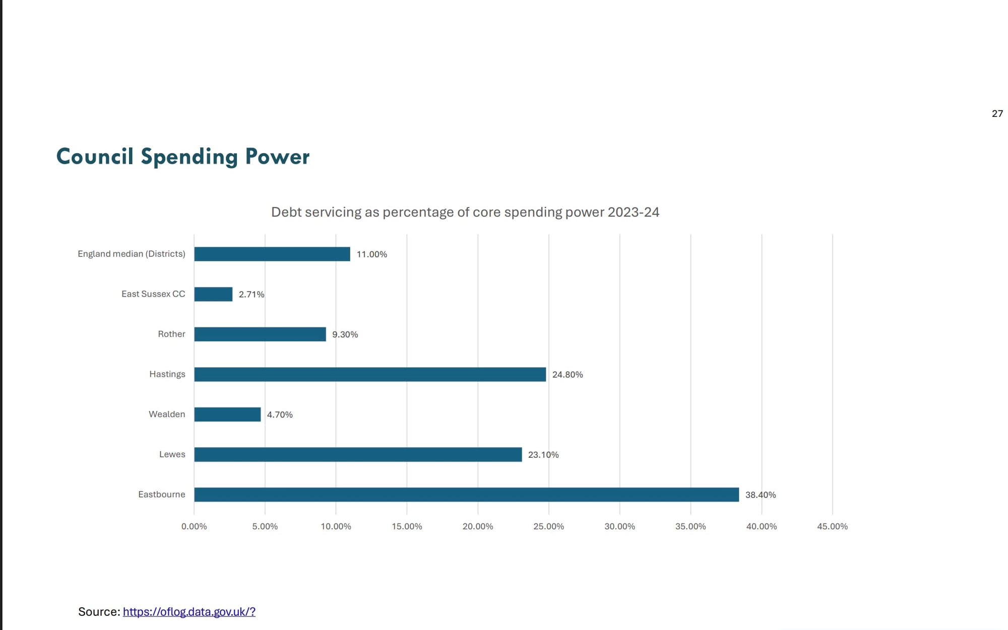 Servicing the debt as a percentage of core spending is 38.4% for Eastbourne. That’s the total amount of money required to pay off the loan or debt including both the original amount borrowed and interest payments.