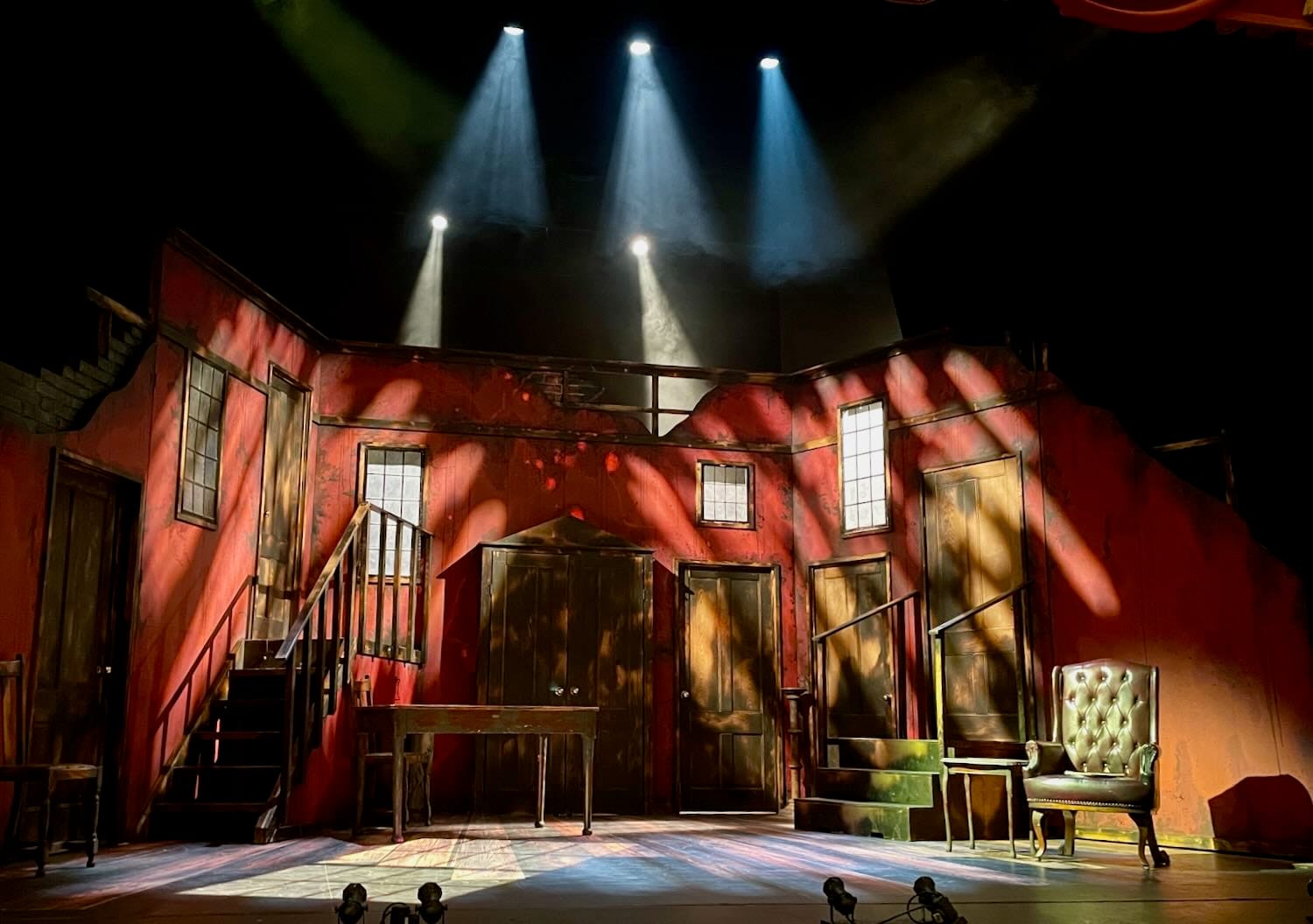 The set is as versatile as the cast. With minimal rearrangement, it becomes an underground station with the sound of passing trains or the basement of a theatre complete with a wardrobe store of props or a dark alley with shadowy figures.