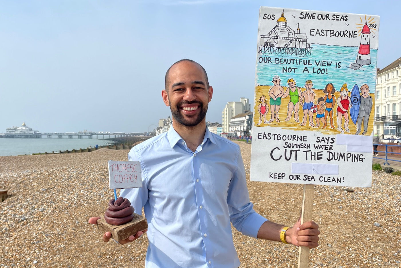 Josh Babarinde, who has announced he is standing down as an Eastbourne borough councillor, told the crowd on the beach: “We are calling for a ban on water company bonuses – these companies should not be rewarded for failure."