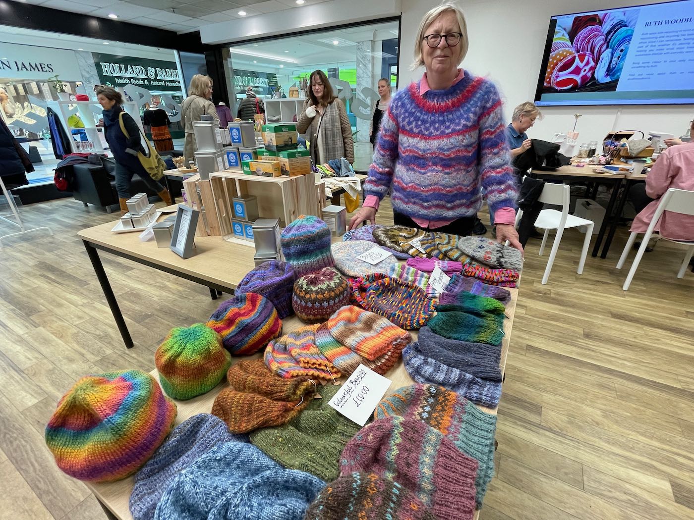:: Emmy’s mum, Felicity Payne, 66, sits in a sofa in Gather clicking away with her needles. She rustles up beautifully knitted berets and beanie hats, often using 1980s vintage wool from her days as a sweater designer.