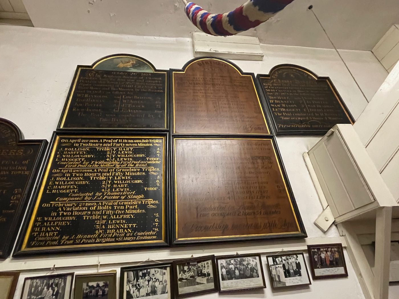 The traditions of modern-day bell ringing go back to the 17th Century. Beautifully engraved boards line the tower room (above), detailing the names of campanologists who took part in peals lasting nearly three hours in the 1880s.
