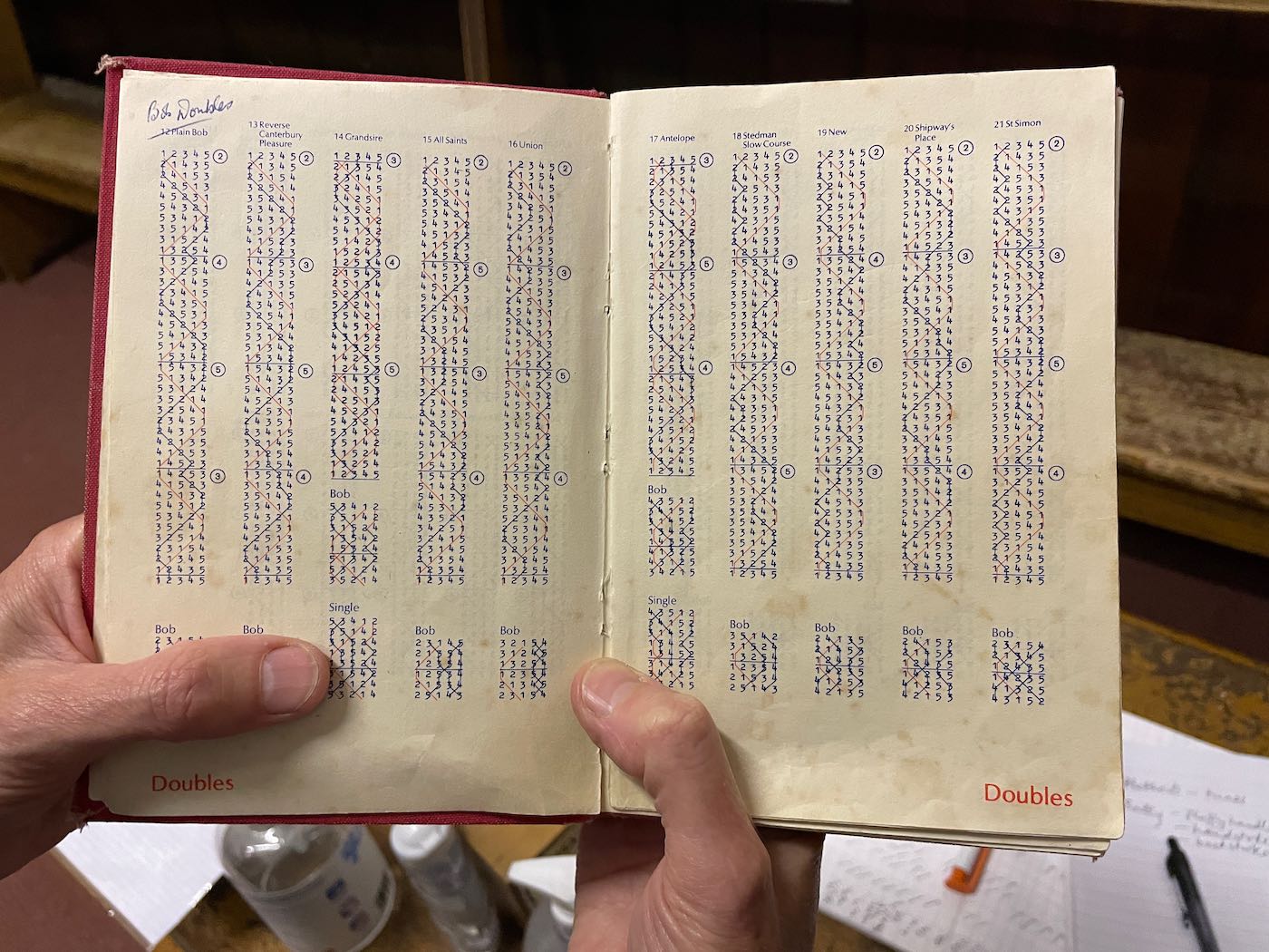 The book of ‘patterns’ (above), which the ringers must memorise to know their sequence, is an extraordinary document. Regulating the order in which the bells are rung is the key to success, and keeping an eye on everyone in the group requires focus.